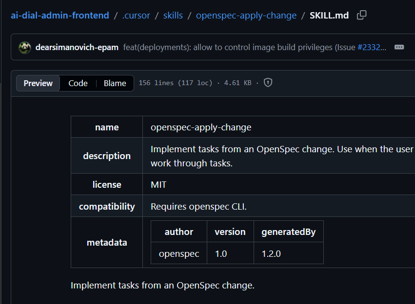 EPAM is an Enterprise Cursor customer with around 63,000 employees, over 55,000 of them engineers and consultants. Their ai-dial-admin-frontend repository has a Cursor skill that connects to OpenSpec, an internal CLI tool for managing code changes.