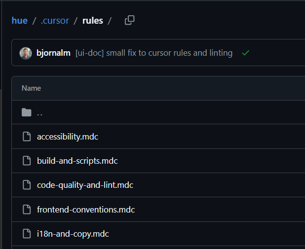 The rules cover their stack (Next.js 14, TypeScript, Tailwind, shadcn/ui) and split into code quality and design. The design section is the more interesting half: "modern and beautiful UI," "clean and consistent design language," "smooth transitions and animations." For a small developer tool company using Cursor to move fast, encoding aesthetic standards in the rules is a deliberate choice. They want the output to look intentional, not generated.