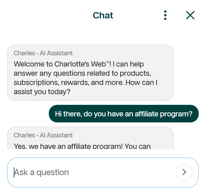 Charlotte's Web uses Klaviyo for AI-powered customer support, on-site customer experience, and email and SMS acquisition. Their AI chat assistant, Charles, handles customer questions in real time directly on the site, covering products, subscriptions, rewards, and account management. That same widget doubles as a customer hub, giving logged-in shoppers access to orders and wishlists, with email and SMS marketing prompts woven in so consent capture feels like part of the account experience rather than an interruption.