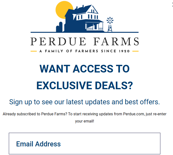 Perdue Farms uses Klaviyo for email and SMS acquisition, cross-brand list building, consumer segmentation, and B2B newsletter management. Their main popup collects email first and then asks for a phone number to opt into SMS, with a clear skip option. The consent copy explicitly covers both perduefarms.com and perdue.com, which is a thoughtful acknowledgment that consumers may only recognize one of the two brand names.