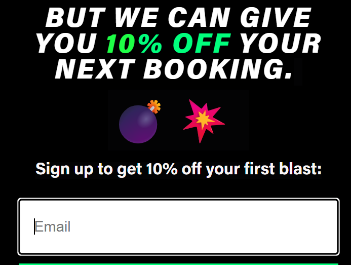 Beat The Bomb uses Klaviyo for location-based marketing, customer retention, and event-driven acquisition. Each physical location has its own dedicated email list, so they can send relevant communications to players in Brooklyn, Atlanta, DC, Houston, Philadelphia, Denver, and Charlotte without blasting everyone with the same message. Their main popup offers 10% off a first booking to capture new subscribers, with an SMS upsell on the second step.